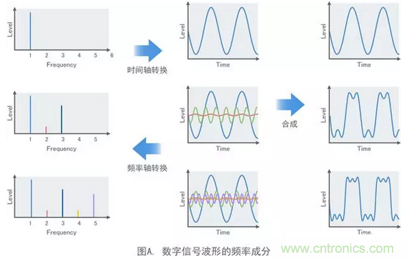 在我學生時代碰到的噪聲中,計算機的時鐘頻率約為4MHz。但是,例如在日本,用于調(diào)頻廣播的頻段為76MHz或更高。噪聲源的時鐘頻率不會與廣播頻率重疊。那問題為什么會出現(xiàn)呢?數(shù)字信號是由基波正弦波和其整數(shù)倍的諧波組成的方波,如圖A所示。方波的上升越急劇,其包含的高次諧波分量越高。這意味著實際的數(shù)字信號具有與調(diào)頻廣播頻帶重疊的諧波分量,從而導致調(diào)頻收音機的聲音中產(chǎn)生噪聲。