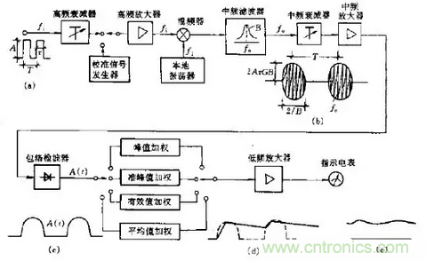其電路結(jié)構(gòu)類(lèi)似于半導(dǎo)體收音機(jī)。測(cè)量時(shí)先將測(cè)量?jī)x調(diào)諧,對(duì)準(zhǔn)某個(gè)頻率fi。該頻率經(jīng)高頻衰減器和高頻放大器后進(jìn)人混頻器,與本地振蕩器的頻率fl混頻,產(chǎn)生很多混頻信號(hào)。經(jīng)過(guò)中頻濾波器以后僅得到中頻f0=fl-fi。中頻信號(hào)經(jīng)中頻衰減器、中頻放大器后,由包絡(luò)檢波器進(jìn)行包絡(luò)檢波,濾去中頻得到其低頻包絡(luò)信號(hào)A(t)。A(t)再進(jìn)一步進(jìn)行加權(quán)檢波,加權(quán)可根據(jù)需要獲得A(t)的峰值(Peak)、有效值(rms)、平均值(Ave)或準(zhǔn)峰值(QP),這些值經(jīng)低頻放大后可推動(dòng)電表指示。測(cè)量前如果用校準(zhǔn)信號(hào)發(fā)生器的信號(hào)進(jìn)行預(yù)先校準(zhǔn), 則可以直接讀數(shù)。騷擾信號(hào)的讀數(shù)等效于正弦信號(hào)的有效植。