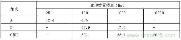 所謂相對(duì)脈沖特性指輸人周期性脈沖信號(hào)時(shí),脈沖的重復(fù)頻率越高,其讀數(shù)越高,重復(fù)頻率低,讀數(shù)低。當(dāng)讀數(shù)不變時(shí)輸人脈沖的幅度和重復(fù)頻率的關(guān)系應(yīng)符合表4的規(guī)定。