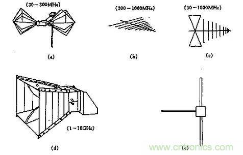 (a) 雙錐天線 (b)對(duì)數(shù)周期天線 (c)混合寬帶天線 (d)喇叭天線 (e)對(duì)稱(chēng)振子天線
