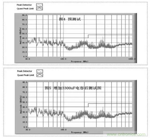 現(xiàn)場測試時,在模塊電源VH2處增加一個3300uf的電解電容,發(fā)現(xiàn)對輻射的抑制作用明顯,特別是在30MHz至1000MHz區(qū)間對毛刺和能量頻譜的抑制作用明顯(見圖4和圖5)。電容值越大,對毛刺尖峰的抑制作用越明顯,濾波后的曲線越平滑。當(dāng)然,電容值的選擇需要按照實際的設(shè)計要求來定。
