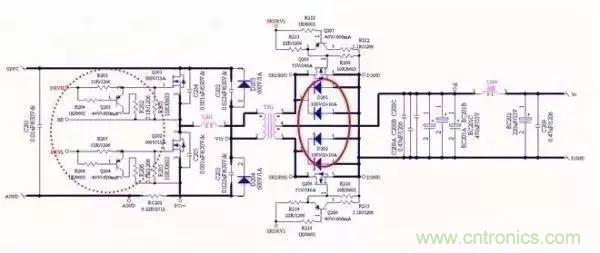LLC電路大家最熟悉不過了,虛線圓圈是驅(qū)動電路,在電路設(shè)計時緊靠MOS管放置,也就是說IC提供的驅(qū)動只需要引二根線拉到驅(qū)動電路,驅(qū)動電路離MOS管近,避免被干擾(同時走線時也要注意驅(qū)動干擾到敏感信號,既是敏感信號也是干擾源);一旦驅(qū)動被干擾電源可想而知。