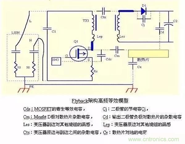 EMC的路徑,當(dāng)然空間輻射是跟環(huán)路有關(guān),環(huán)路也是路徑構(gòu)造成的;分析出反激高頻等效模型,幫助理解EMC形成的機(jī)理;我們的測試接收設(shè)備會從L,N端接收傳導(dǎo),為了減小接收的干擾,就必須讓干擾通過地回路流通而不從L,N端口流向接收設(shè)備;這時候我們的EMI電感以及Y電容通過阻抗匹配就可以實(shí)現(xiàn);另外原邊的干擾可以通過原副邊Y電容,變壓器雜散電容以及大地耦合到副邊,形成更多的回路;當(dāng)然一些結(jié)電容參數(shù),如MOS管結(jié)電容,散熱器結(jié)電容也能構(gòu)成流通路徑;