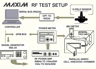Maxim的RF測(cè)試裝置(圖2)產(chǎn)生用于測(cè)試RF抗干擾能力的RF場。測(cè)試電波暗室具有一個(gè)屏蔽室,作用與法拉第腔的屏蔽室類似,具有連接電源和輸出監(jiān)視器的端口。把下面列舉的設(shè)備連接起來就可以組成測(cè)試裝置: