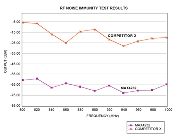 而器件X的噪聲抑制平均讀數(shù)僅有-18dBV,這意味著在RF影響下輸出變化為125mVRMS (相對(duì)于1V)。這個(gè)增加值很大,是正常值50µVRMS的2500倍。因此,器件X的RF抗干擾能力很差(-18dBV),當(dāng)靠近蜂窩電話或其它RF源時(shí)可能無法正常工作。顯然,對(duì)于音頻處理應(yīng)用如耳機(jī)放大器和話筒放大器,MAX4232是一個(gè)更好的選擇。