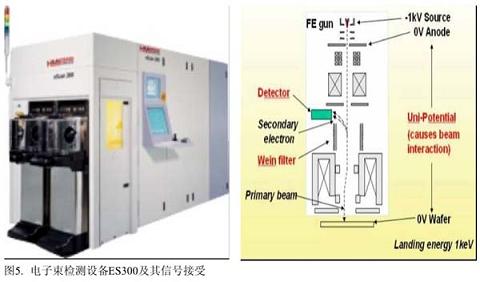 首先,它擺脫了照明光源,檢測(cè)結(jié)果不會(huì)受到類似變色、厚度不均等各種層面所帶來(lái)的物理因素的影響;其次,電子束的分辨率極高。因?yàn)樗臋z測(cè)單位是電子,電子要比微波以及任何尺寸的顆粒或缺陷都要小得多;再次,電子是帶有電性的電荷,所以它可以被用于分析材料的電性或電組織成分,這被稱作電壓對(duì)比度圖像,經(jīng)常被用于檢測(cè)類似開閉鎖等電子電路缺陷和通孔蝕刻不足等材料缺陷。電子束檢測(cè)設(shè)備一般有KLA-Tencor和HMI公司的Escan系列(如圖5所示)。