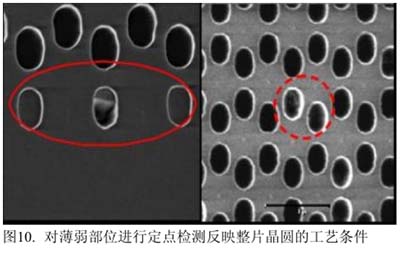 自動(dòng)工藝檢測(cè)技術(shù)是對(duì)電子束檢測(cè)技術(shù)補(bǔ)充。在實(shí)際生產(chǎn)過程中,常常能發(fā)現(xiàn)通孔刻蝕的一些系統(tǒng)性缺陷,它主要由于刻蝕設(shè)備及其工藝在調(diào)試過程中還沒達(dá)到最好的工藝窗口,或者工藝窗口的漂移使刻蝕設(shè)備的一些薄弱部位提前顯現(xiàn)在通孔刻蝕工藝過程中。實(shí)驗(yàn)過程中通過對(duì)一顆產(chǎn)品的薄弱部位進(jìn)行定點(diǎn)檢測(cè),來(lái)反映整片晶圓的工藝條件(如圖10所示)。