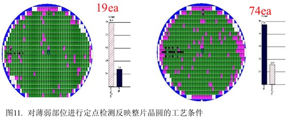 最終的實(shí)驗(yàn)證明自動(dòng)工藝檢測(cè)結(jié)果與最終良率的對(duì)應(yīng)關(guān)系。表明自動(dòng)工藝檢測(cè)可以反映存儲(chǔ)單元內(nèi)接觸孔通孔刻蝕的狀態(tài)。對(duì)于在生產(chǎn)線上檢驗(yàn)到薄弱部位有刻蝕不完全比較多的晶圓,其對(duì)應(yīng)的正常存儲(chǔ)單元內(nèi)也有較多的接觸孔有刻蝕不完全問題。可以通過對(duì)產(chǎn)品的薄弱部位進(jìn)行監(jiān)測(cè)達(dá)到對(duì)正常存儲(chǔ)單元內(nèi)接觸孔刻蝕狀態(tài)的實(shí)時(shí)反映,這對(duì)接觸孔的刻蝕工藝改進(jìn)有極大的促進(jìn)作用(如圖11所示)。