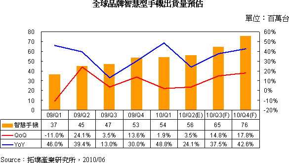 受到新興市場換機(jī)潮與新用戶的加入,以及成熟歐美市場新規(guī)格、新應(yīng)用的持續(xù)推出等因素激勵(lì),拓墣產(chǎn)業(yè)研究所預(yù)估2010年全球品牌手機(jī)出貨量可望達(dá)13.29億支,較2009年成長11.7%,2010下半年出貨表現(xiàn)將優(yōu)于上半年,通訊產(chǎn)業(yè)研究中心謝雨珊副理分析,在智慧型手機(jī)快速低價(jià)化、iPhone 4上市之下,促使品牌廠相繼推出新款智慧型手機(jī)搶市,預(yù)估2010年全球智慧型手機(jī)出貨量為2.51億支,年成長率達(dá)37.9%,連續(xù)三年以超過30%以上高成長率攻占市場,2011年全球智慧型手機(jī)出貨量更挑戰(zhàn)4億支關(guān)卡,滲透率將從2010年的18.9%,攀升至2011年的27.6%,屆時(shí)每四款手機(jī)中即有一款是智慧型手機(jī)。