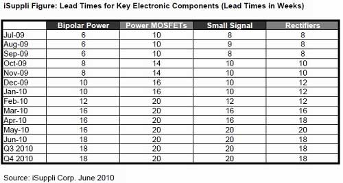iSuppli指出,整體市場(chǎng)的交貨期比一個(gè)月以前所預(yù)期的拉長(zhǎng)很多;例如功率 MOSFET 與小型訊號(hào)晶體管的交貨期在6月時(shí)約20周,雙極功率組件(bipolar Power devices)與整流器的交貨期則為18周;而在正常情況下,這些零組件的交貨期應(yīng)該是10~12周。
