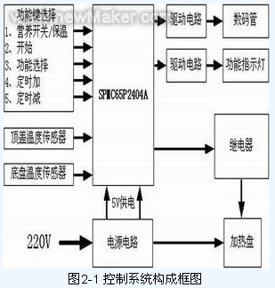 利用凌陽8位MCU設(shè)計(jì)的智能電飯煲控制系統(tǒng)原理框圖如圖2-1所示,通過按鍵來選擇功能模式、顯示電路完成顯示當(dāng)前狀態(tài)和定時(shí)時(shí)間;通過溫度傳感器來對溫度進(jìn)行采樣;通過MCU的控制終極實(shí)現(xiàn)對繼電器的控制,從而來控制對加熱盤的加熱與否,電源部分完成對單片機(jī)系統(tǒng)和外圍電路提供5V電源,并且對加熱盤進(jìn)行加熱。