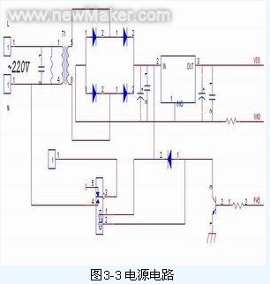 電源部分為單片機(jī)提供+5V的直流穩(wěn)壓源,并且通過降壓、整流、濾波之后的+14V電壓對繼電器進(jìn)行供電,通過控制三極管射極的導(dǎo)通與否來控制繼電器的工作狀態(tài)。電源電路原理圖如圖3-3所示: