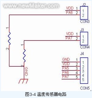 J2和J3是溫度傳感器的兩個(gè)接口,其中J2和J3分別是頂蓋和底盤溫度傳感器的接口,單片機(jī)檢測的信號實(shí)際上是與溫度傳感器分壓的電阻的電壓值,由于溫度傳感器的電阻值會隨溫度的上升而減小,所以分壓電阻的電壓值間接反映了某一時(shí)刻的溫度,電路原理圖如圖3-4所示: