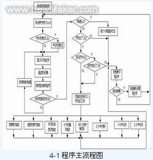 從樣機(jī)分析中大致設(shè)計(jì)整個(gè)系統(tǒng),整個(gè)系統(tǒng)輸進(jìn)包括2個(gè)溫度傳感器,5個(gè)按鍵;輸出包括2位七段數(shù)碼管、10個(gè)發(fā)光二極管、繼電器控制信號等。根據(jù)控制功能,將程序設(shè)計(jì)為幾個(gè)主要的模塊,程序主流程見圖4-1所示:
