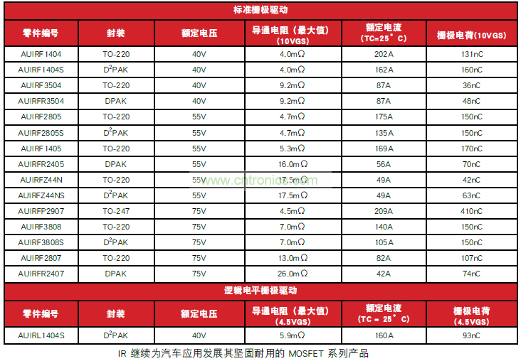 International Rectifier 的符合汽車標(biāo)準(zhǔn)的最新 MOSFET 系列具有低通態(tài)電阻和高電流處理能力,可滿足傳統(tǒng)內(nèi)燃機(jī)(ICE) 平臺以及微型和混合動力汽車平臺方面的重負(fù)載應(yīng)用。