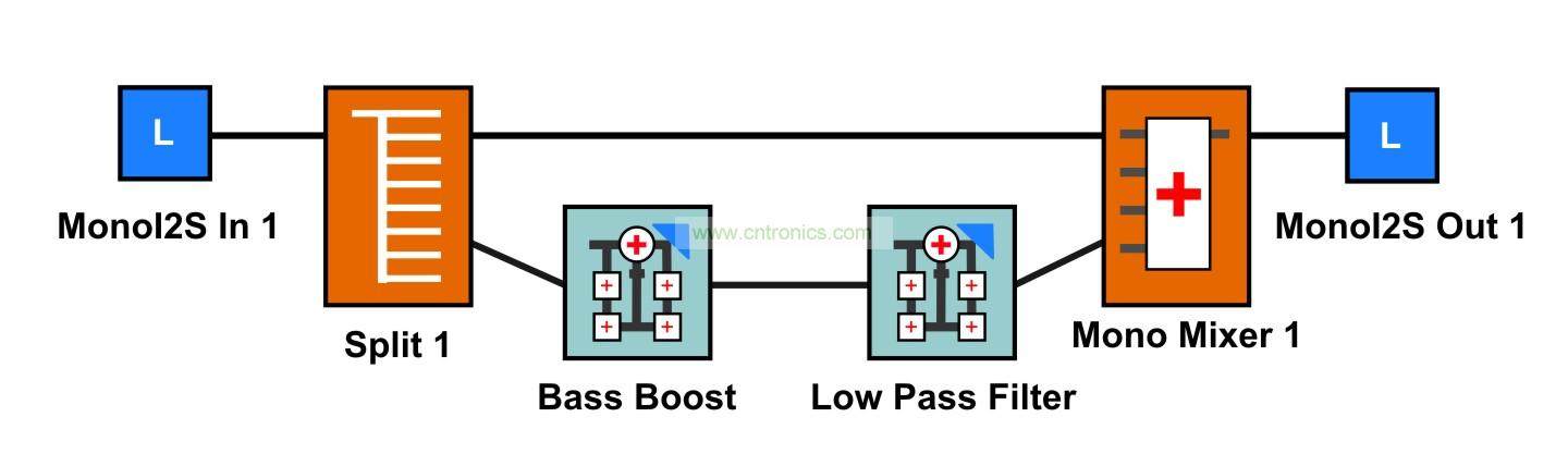 如果增頻頻率大體上較低,則請(qǐng)嘗試在增益級(jí)后面增加一個(gè)低通濾波器,以降低限幅引起的高頻。在模擬系統(tǒng)中,使用足夠高的截頻速率來構(gòu)建這種低通濾波器通常要求有一個(gè)多階濾波器,從而讓系統(tǒng)變得體積龐大且成本高昂。但是,在數(shù)字處理系統(tǒng)中卻可以輕松實(shí)現(xiàn),條件是在音頻處理器中有足夠的有效MIPS。圖2 顯示了軟限幅時(shí)一個(gè)處理流程的例子。