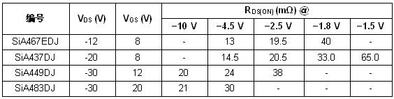 對于電源管理中的負載和電池開關(guān),以及智能手機、平板電腦、移動計算設(shè)備、硬盤驅(qū)動器和固態(tài)驅(qū)動的同步降壓轉(zhuǎn)換應(yīng)用里的控制開關(guān),-12 V SiA467EDJ提供了13m?(-4.5V)的極低導(dǎo)通電阻。-20V SiA437DJ的導(dǎo)通電阻為14.5m?(-4.5V),-30V SiA449DJ和SiA483DJ的導(dǎo)通電阻分別只有20m?(-10V)和21m?(-10V)。另外,SiA437DJ和SiA467EDJ的電流等級高達30A,承受很大的涌入電流,可用于負載開關(guān)。