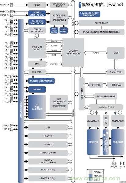 圖一 : 考量到資料傳輸?shù)氖褂们榫?,整合無(wú)線(xiàn)傳輸功能的MCU已是相當(dāng)常見(jiàn)的晶片。此為T(mén)I旗下某一BLE晶片的方塊圖。(Source:TI)
