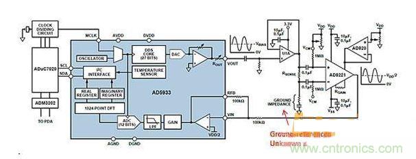 圖1. ADI AD5933與AFE相配合,用于測量凝血測量系統(tǒng)中的地基準阻抗