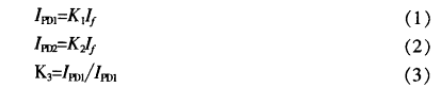 HCNR200型的線(xiàn)性光耦合器,作為一種高線(xiàn)性度的光耦元件,其本身是由3個(gè)光電元件組成,其中LED為高性能的AlGaAs型發(fā)光二極管,PDl、PD2是兩個(gè)用同種工藝制成從而具有嚴(yán)格比例關(guān)系的光敏二極管。當(dāng)LED中流過(guò)電流If時(shí),其所發(fā)出的光會(huì)在PD1和PD2中感應(yīng)出正比于LED發(fā)光強(qiáng)度的光電流IPD1、IPD2,其中If、IPD1、IPD2三者之間滿(mǎn)足以下關(guān)系式: