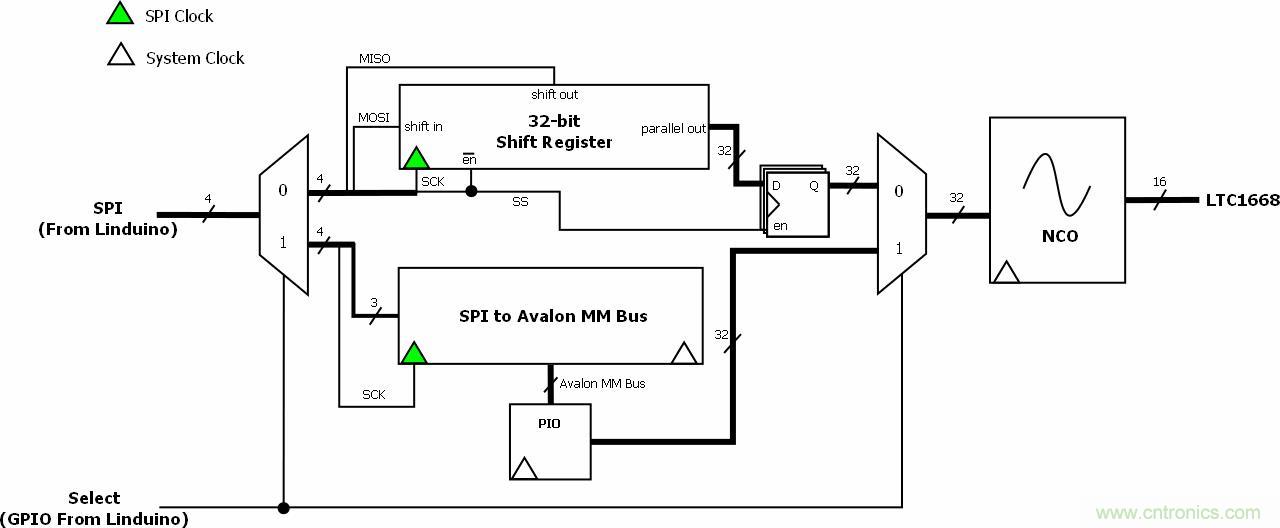 圖4顯示了系統(tǒng)框圖。注意,數(shù)字控制振蕩器(NCO)可以由移位寄存器或PIO內(nèi)核進(jìn)行控制。移位寄存器用于調(diào)試,因?yàn)樗梢灾苯涌刂芅CO。將GPIO線置高將激活SPI-Avalon橋,進(jìn)而控制Avalon總線上的32位PIO端口。PIO輸出隨即用于控制NCO頻率。