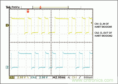 該變送器參考設計也支持HART®協議,可以方便地連接HART調制解調器,例如DS8500 (見圖12)。圖10和圖11所示為249Ω負載電阻時1000ft 4–20mA電流環(huán)上的HART信號。