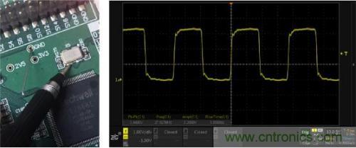 以晶振信號測量為例,如圖1所示為常規(guī)的鱷魚線接地測量方法,可看到信號過沖嚴重伴隨振蕩,和想像中的方波不一樣。而圖2所示的短地線彈簧接地測量方法,波形端正不少,顯然資深工程師的方法沒錯。