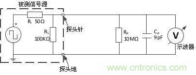 且看圖解,如圖3所示為示波器使用探頭進行信號測量理論上的等效模型。探頭與示波器組成具有一定輸入電阻和輸入電容的測試設(shè)備;被測量信號等效為具有一定內(nèi)阻與工作負載的源。
