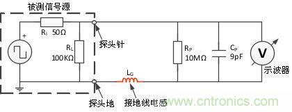 由于地線是一根導線,因此它有一定數(shù)量的分布式電感,線越長電感則越大。常規(guī)的測量方法就會由鱷魚線引入分布式感,此時它的等效模型如圖4所示的LG電感,這一電感將與探頭電容相互影響,在LG和CP值確定的某個頻點上形成諧振,導致減幅振蕩現(xiàn)象的產(chǎn)生。