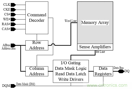 圖1顯示SDRAM的簡要功能方塊圖,行地址選通信號(hào)(CAS#)是根據(jù)預(yù)充電而設(shè)計(jì)的延遲控制信號(hào),亦即無預(yù)充電則不必分時(shí)控制列地址選通信號(hào)(RAS#)、CAS#。差動(dòng)頻率信號(hào)(CLK, CKE)的頻率是基于微處理器的工作頻率,數(shù)據(jù)屏蔽信號(hào)(DQM)對(duì)應(yīng)差動(dòng)頻率信號(hào)的邊緣;這些信號(hào)用于進(jìn)行同步傳輸操作。對(duì)于感測(cè)放大器以及寫入驅(qū)動(dòng)器的配置規(guī)劃,通常根據(jù)外部數(shù)據(jù)總線的位寬度而設(shè)計(jì)相同的數(shù)量,然而,可以導(dǎo)入并行存取的方法來增加存取效率,因此增加了行地址的位寬度以選擇同列不同行的感測(cè)放大器與寫入驅(qū)動(dòng)器。這種方法產(chǎn)生了叢發(fā)模式(burst mode)以及同列存取,但并不會(huì)增加訪問速度,并且還要進(jìn)行同步傳輸操作,所以需要數(shù)據(jù)緩存器。