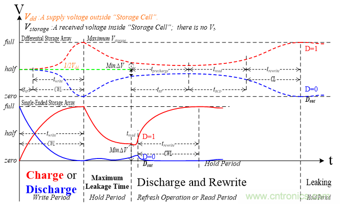 如果說3T DRAM是第一代DRAM技術(shù),使用差動(dòng)放大器實(shí)現(xiàn)讀取功能的1T DRAM是第二代DRAM,那么在本文中的第三代DRAM技術(shù)是指取代差動(dòng)放大器且大幅提升讀取功能的存取技術(shù)。1T DRAM的內(nèi)存基本單位是由一晶體管和一電容器所組成的儲(chǔ)存單元,又稱為1T DRAM單元。圖3顯示在單一儲(chǔ)存單元上進(jìn)行存取操作的波形,上半部分是使用差動(dòng)放大器的第二代技術(shù),下半部分是第三代技術(shù),此圖主要用于比較這二者完成讀取操作所需花費(fèi)的最長時(shí)間。當(dāng)這一電容器的儲(chǔ)存電壓(Vstorage)放電達(dá)到最小差異電壓(Min. ?V)時(shí)就必須立即進(jìn)行更新操作(即讀取),所以此圖呈現(xiàn)有關(guān)讀取操作的最長時(shí)間就等于是更新操作的最長時(shí)間。圖中標(biāo)示有tprecharge、tread、trewrite、twrite,這些技術(shù)用語依序?qū)?yīng)產(chǎn)品規(guī)格的tRP、tRCD、CL與CWL。第三代技術(shù)無需tRP,除此之外,tRCD也很短暫且可由CWL替換CL,因此訪問速度接近SRAM,存取效率低于SRAM。