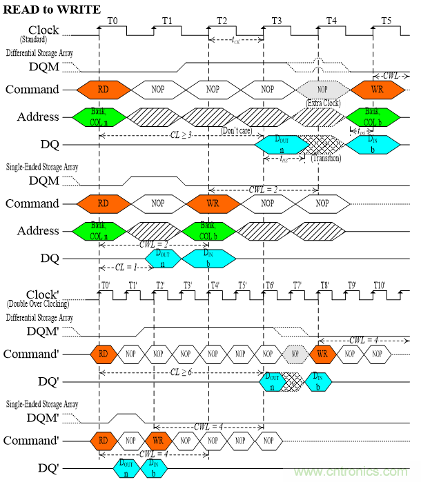 圖4用于觀察SDRAM的命令序列對(duì)于不同存取技術(shù)所發(fā)生的變化,此圖用于比較第二代與第三代技術(shù)之間的存取效率。SDRAM的命令序列有多種組合,其中讀取命令至寫入命令(READ to WRITE)最能突顯不同存取技術(shù)之間的差異。第三代技術(shù)的讀取時(shí)間(tread)很短,于是CL值可以很小,但受到差動(dòng)頻率信號(hào)以及DQM信號(hào)的限制而不能等于0;另外,即使CL值等于1也還有回寫時(shí)間(trewrite),所以第三代技術(shù)要以CWL值來替換CL值。