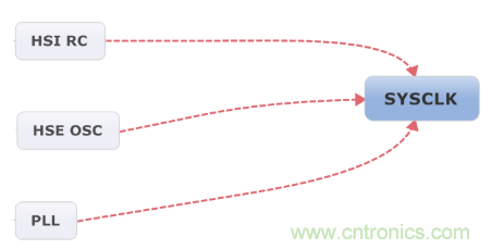 1、 SYSCLK時(shí)鐘源有三個(gè)來(lái)源:HSI RC、HSE OSC、PLL