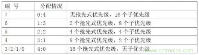 兩種優(yōu)先級(jí)由4位二進(jìn)制位決定。分配下來(lái)有十六種情況: