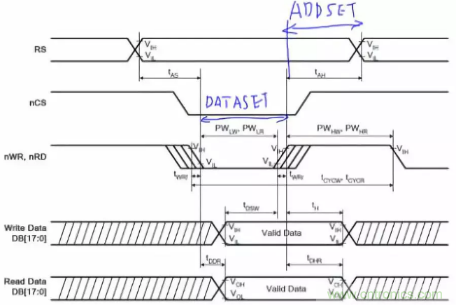 而ADDSET指的是地址建立時(shí)間,指的是片選之后到讀/寫操作之前的時(shí)間,這是針對(duì)SRAM來(lái)說(shuō)的,如果操縱的是TFT,不存在地址線,所以此時(shí)的ADDSET就是讀/寫信號(hào)結(jié)束到RS電平的轉(zhuǎn)換時(shí)間。