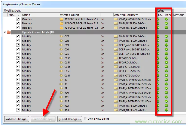 4、對封裝進(jìn)行完編輯或添加等操作之后,執(zhí)行右下角的“Accept Changes(Create ECO)”命令,對更新內(nèi)容點擊“Execute Changes”更新到原理圖當(dāng)中,如圖1-4。