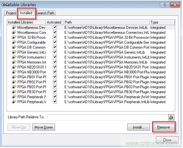 2、如圖1-6所示,單擊“Libraries”按鈕,進(jìn)入庫的安裝編輯界面,在圖中選擇“Installed”下的所有封裝庫,再單擊“Remove”按鈕,完成系統(tǒng)關(guān)聯(lián)庫的移除操作。