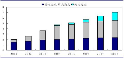 戴爾的這一舉措表明 LED 已經(jīng)不再作為概念機(jī)型或者說時尚機(jī)型,而是作為標(biāo)準(zhǔn)配置,其價格策略必然不再采取高端策略。戴爾作為行業(yè)內(nèi)的領(lǐng)導(dǎo)廠商之一,其他公司必然跟進(jìn)。因此2009 年LED 在筆記本的滲透率有望達(dá)到20%以上。2007年全球筆記本出貨1.09 億臺,2008年增長15%,2009 年增長10%,則2009 年筆記本出貨1.4 億臺,其中將有2800 萬臺使用LED,對LED 的需求量是70.3 億粒。