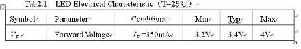 其次,恒功率控制都是預(yù)先假定輸出功率是恒定的,比如用9個(gè)1W(=3.4V, =350MA)的LED串聯(lián)起來用做一個(gè)9W的PAR燈,那么設(shè)計(jì)時(shí)候就會(huì)用=9W來計(jì)算。但實(shí)際上每個(gè)LED的都會(huì)偏差,偏差值如表2.1所示: