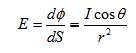 照度(Luminosity)指物體被照亮的程度,采用單位面積所接受的光通量來表示,表示單位為勒[克斯](Lux),即lm/m2。1勒[克斯]等于1流[明](lm)的光通量均勻分布于1m2面積上的光照度。LED陣列的照度是多個單個LED照度的線性疊加。因此只分析單個LED照度。通常LED所照射的目標距離比LED本身大的多,在這種情況下將LED發(fā)光管簡化為一個有一定空間光強分布的點光源。點光源的特點是能以4立體角向周圍空間發(fā)出相同發(fā)光強度的光輻射。假設面元dS接受LED點光源S的光照,設點光源S至面元dS的距離為r,并且點光源發(fā)出的元光束的光軸與面元的法線N之間的夾角為,則面元上的照度為: