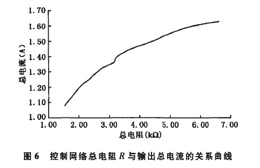 控制電路阻值與輸出總電流的關(guān)系列于表1,其中R為控制電路的等效電阻。經(jīng)過在恒溫箱中測試,每2℃記錄1組數(shù)據(jù)得到如圖5所示的NTC熱敏電阻的溫度一阻值曲線。該方案中,驅(qū)動電源通過接收到反饋的溫度信息來控制輸出電流,根據(jù)圖5中NTC的溫度與阻值的關(guān)系,只要找到輸出電流隨總阻值的變化關(guān)系(如圖6所示),再進行適當(dāng)?shù)碾娮杵ヅ?,便可找到溫度與驅(qū)動器輸出電流的關(guān)系。
