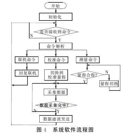 系統(tǒng)軟件采用C語(yǔ)言編寫,在IAR公司提供的集成調(diào)試環(huán)境Workbech下采用模塊化思想進(jìn)行設(shè)計(jì)。系統(tǒng)的軟件程序固化在MSP430F149單片機(jī)的內(nèi)部Flash存儲(chǔ)器中。系統(tǒng)的程序流程如圖4所示。整個(gè)流程可分為初始化、命令解析、數(shù)據(jù)測(cè)量、數(shù)據(jù)處理及顯示程序。程序設(shè)計(jì)借鑒實(shí)時(shí)操作系統(tǒng)的思想,劃分事件和目標(biāo)。系統(tǒng)按照工作過(guò)程共有命令解析、聯(lián)機(jī)、校準(zhǔn)、測(cè)量判斷、數(shù)據(jù)采集、數(shù)據(jù)打包發(fā)送等幾個(gè)事件,通過(guò)對(duì)事件的處理來(lái)完成相應(yīng)的功能,并進(jìn)行必要的狀態(tài)轉(zhuǎn)換。當(dāng)電壓改變后,接收到測(cè)量命令,進(jìn)入測(cè)量狀態(tài),將數(shù)據(jù)發(fā)送并顯示,回到空閑狀態(tài)繼續(xù)等待命令然后進(jìn)行相應(yīng)的操作。