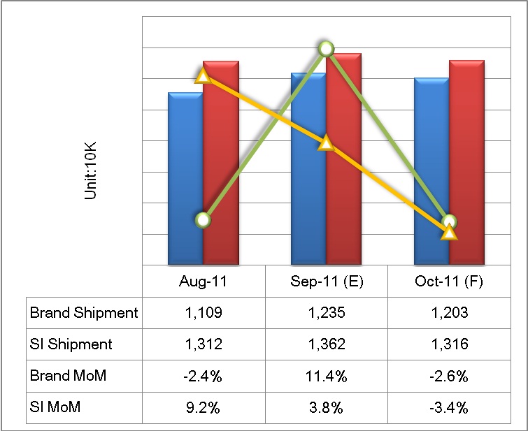 根據(jù)集邦科技(TrendForce)旗下研究部門WitsView全球前十大液晶監(jiān)視器出貨調(diào)查顯示,前十大品牌廠商2011年8月在美系廠商因季初而導(dǎo)致出貨動能疲軟,加上終端消費市場需求依然平淡下影響下,MoM下滑至2.4%,為1,109萬臺。一如WitsView預(yù)期,8月份SI陸續(xù)接獲第四季品牌短單及部分SI出貨從谷底攀升下,呈現(xiàn)較高幅度之月成長,達9.2%。展望SI第四季出貨,WitsView表示由于2012中國農(nóng)歷年在一月下旬較往年為早,為因應(yīng)中國新年假期而引起的缺工問題,部分第一季需求將提前在第四季反應(yīng),QoQ出貨將呈現(xiàn)小幅成長。展望品牌九月出貨,除了季底需沖刺出貨量及部分區(qū)域的教育市場訂單釋出外,品牌廠商亦摩拳擦掌為中國十一長假銷售準備,因此WitsView預(yù)估九月將有9-12%出貨成長空間。