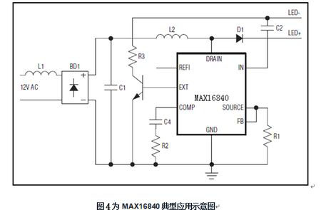 而MAX16840芯片有3個(gè)重要引腳功能:FB引腳電壓可檢測(cè)輸入電流,并調(diào)節(jié)其平均值;而輸入引腳(REFI)用于設(shè)置輸入電流值,引腳電壓低于特定門限時(shí),輸入電流與該電壓成正比,電壓超過(guò)特定門限時(shí),輸入電流將置于固定的預(yù)置水平。據(jù)此利用REFI的非線性特性,連接一個(gè)NTC電阻,即可得到熱折返保護(hù);IN引腳具有內(nèi)部過(guò)壓保護(hù),避免內(nèi)部開關(guān)MOSFET在LED串開路或LED串電壓過(guò)高時(shí)損壞;它帶有一個(gè)獨(dú)立的EXT引腳,確保低輸入電壓開啟時(shí)提供一個(gè)觸發(fā)啟動(dòng)電流,以配合電子變壓器正常工作。EXT驅(qū)動(dòng)外部npn晶體管,一旦IN跌落到5.5V UVLO門限以下,將EXT拉至地電平,外部npn晶體管關(guān)斷。其IC采用3mm x 3mm、10引腳、TDFN封裝,-40°C至+125°C工作溫度范圍。圖4為MAX16840典型應(yīng)用示意圖。它被廣泛應(yīng)用于MR16及其它12V交流或直流輸入LED照明之中。