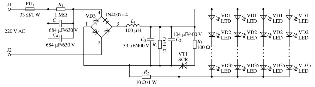 該電路共驅(qū)動140只白光LED (小功率) ,采用35串4并的模式,采用電容降壓式驅(qū)動方式。其中, C1、C4 為并聯(lián)的兩個相同的電容,起降壓及限流作用; 4個1N4007組成的整流橋?qū)斎虢涣麟妷哼M行整流;濾波電容C3 用于濾除整流輸出電壓中的交流成分,使電壓更為平滑; L1、C2 用于濾除輸出電壓中的高頻成分;電阻R4 為C3 提供放電回路;采用單向晶閘管SCR729210對電路進行保護, R3 為限流電阻。