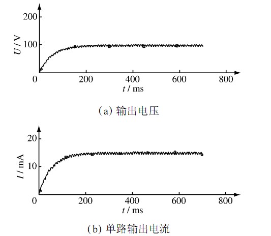為理論上驗證設(shè)計的可行性,采用PSp ice軟件對電路進行了仿真分析。結(jié)果如圖2所示。電路在210 ms時進入穩(wěn)定狀態(tài),穩(wěn)定后其輸出電壓為97 ±2. 2 V,輸出電流為14. 7 ±0. 3 mA,基本驗證了電路設(shè)計的可行性。LED 日光燈電路輸出特性如圖2所示。