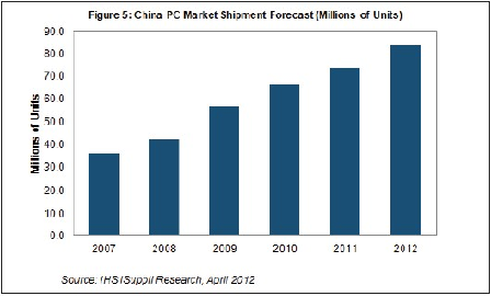 IHS公司預(yù)測,2012年中國占全球臺(tái)式PC出貨量的份額將從2011年的7%上升到11%。