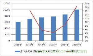 2010---2015年全球激光設(shè)備銷售規(guī)模(單位:百萬(wàn)美元)