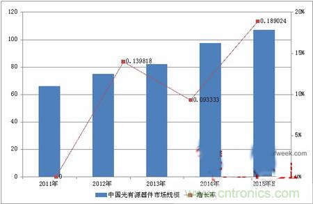 據(jù)OFweek行業(yè)研究中心出版的《2015-2018年中國光有源器件市場分析及前景預(yù)測報告》顯示,2011年-2014年中國光有源器件市場規(guī)模增長較快,年復(fù)合增長率達(dá)到14%。未來幾年會有所放緩,年復(fù)合增長率會降至10%左右。2014年中國光有源器件市場規(guī)模為97.5億元人民幣,估計(jì)2015年將達(dá)到107億元。