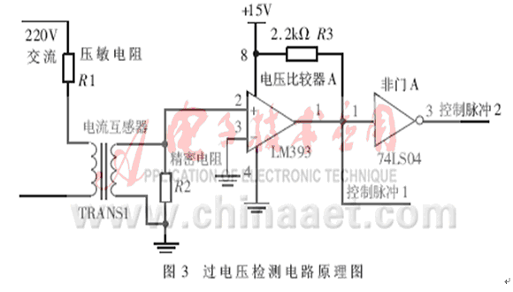 過電壓檢測電路原理圖如圖3所示。當(dāng)有過電壓信號產(chǎn)生時,壓敏電阻被擊穿,呈現(xiàn)低阻值甚至接近短路狀態(tài),這樣在電流互感器的原級產(chǎn)生一個大電流,通過線圈互感作用在副級產(chǎn)生一個小電流,再通過精密電阻把電流信號轉(zhuǎn)變?yōu)殡妷盒盘枺贿@個信號輸入到電壓比較器LM393后,電壓比較器LM393輸出高電平,經(jīng)過非門A輸出的控制脈沖1控制電源回路,斷開開關(guān)電源電路,啟動備用電源??刂泼}沖2 送到單片機(jī)的中斷口,單片機(jī)控制回路啟動A/D轉(zhuǎn)換,采樣過電壓的瞬時值。